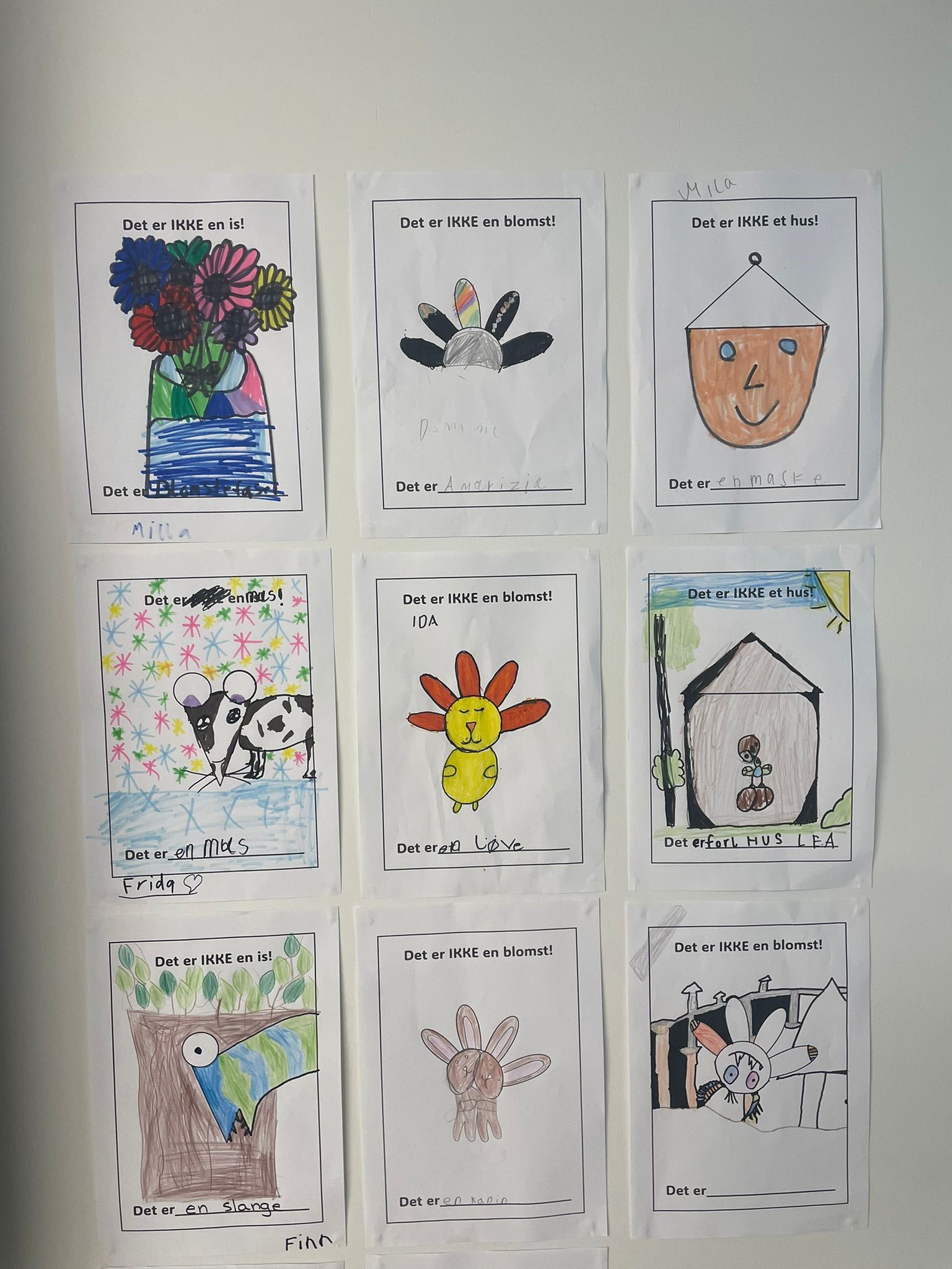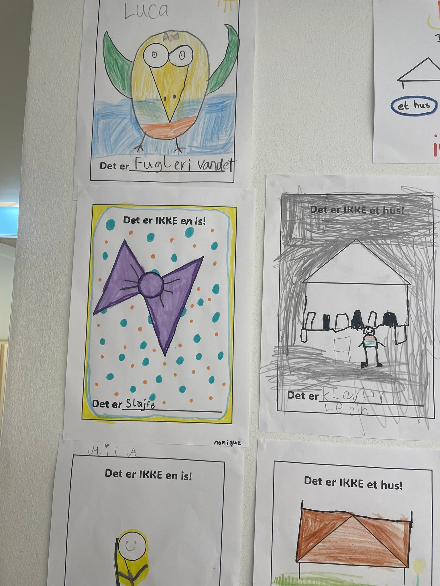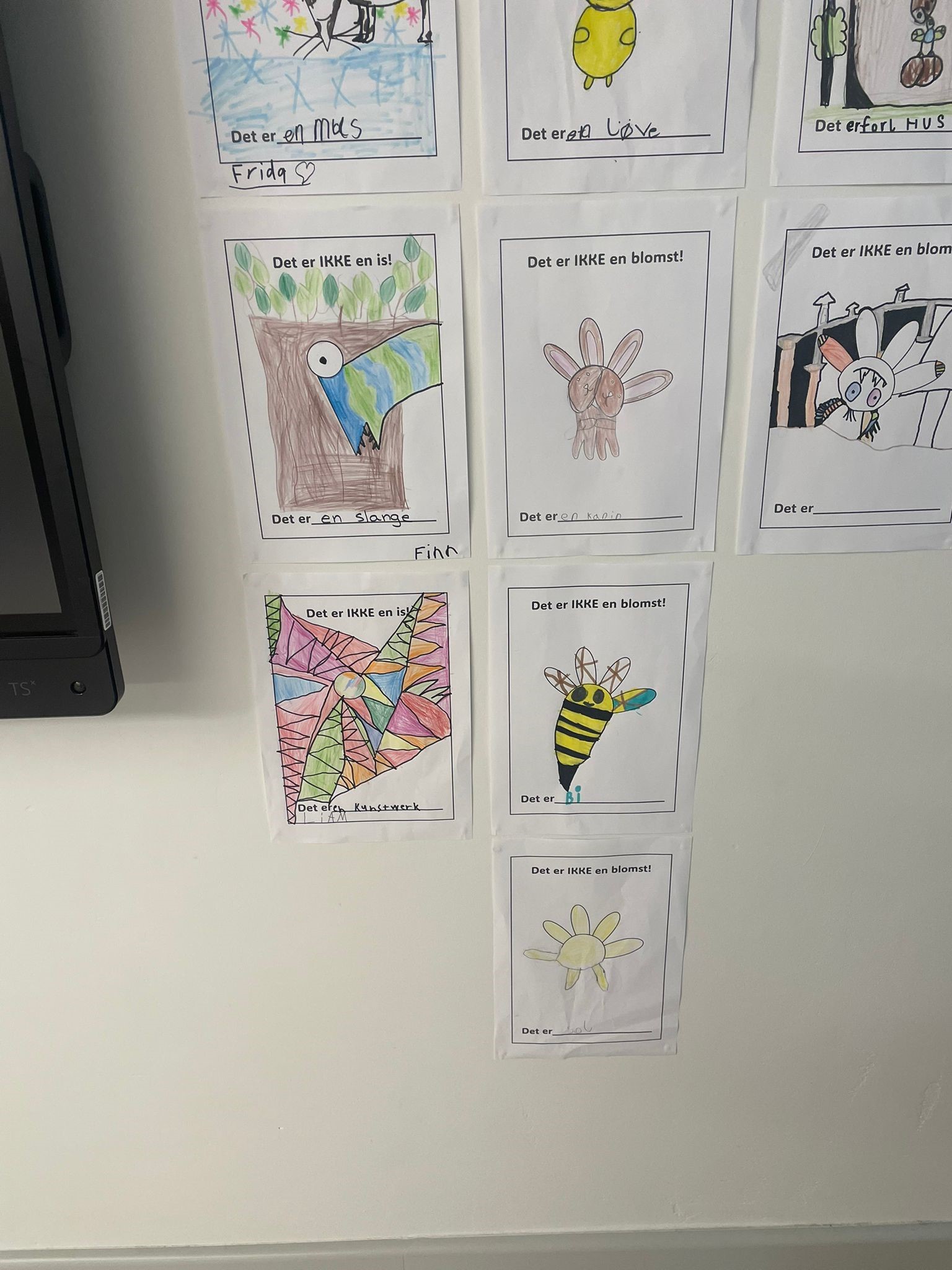 I skolens fællesområde kan alle nyde flotte kunstværker, som indskolingen har lavet. Eleverne fik udlevet halv færdige billeder, som de skulle tegne videre på. Overskriften er "Det er ikke...".