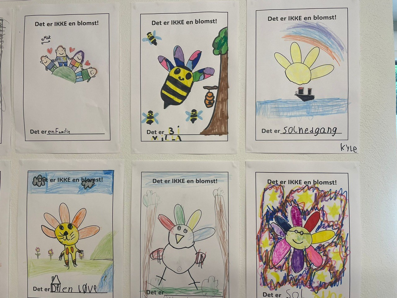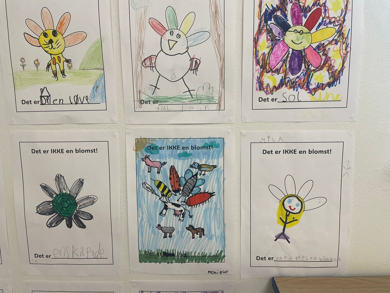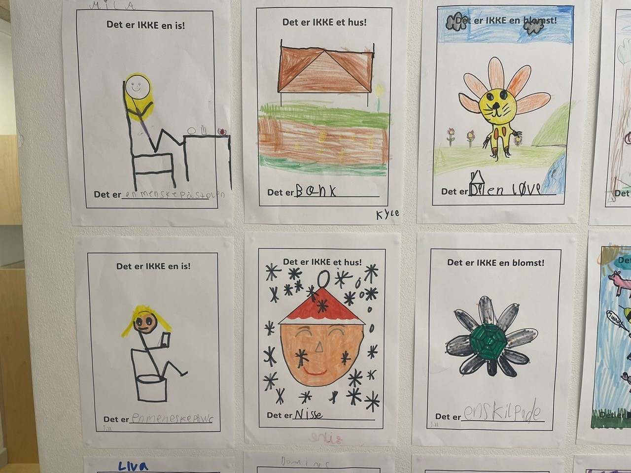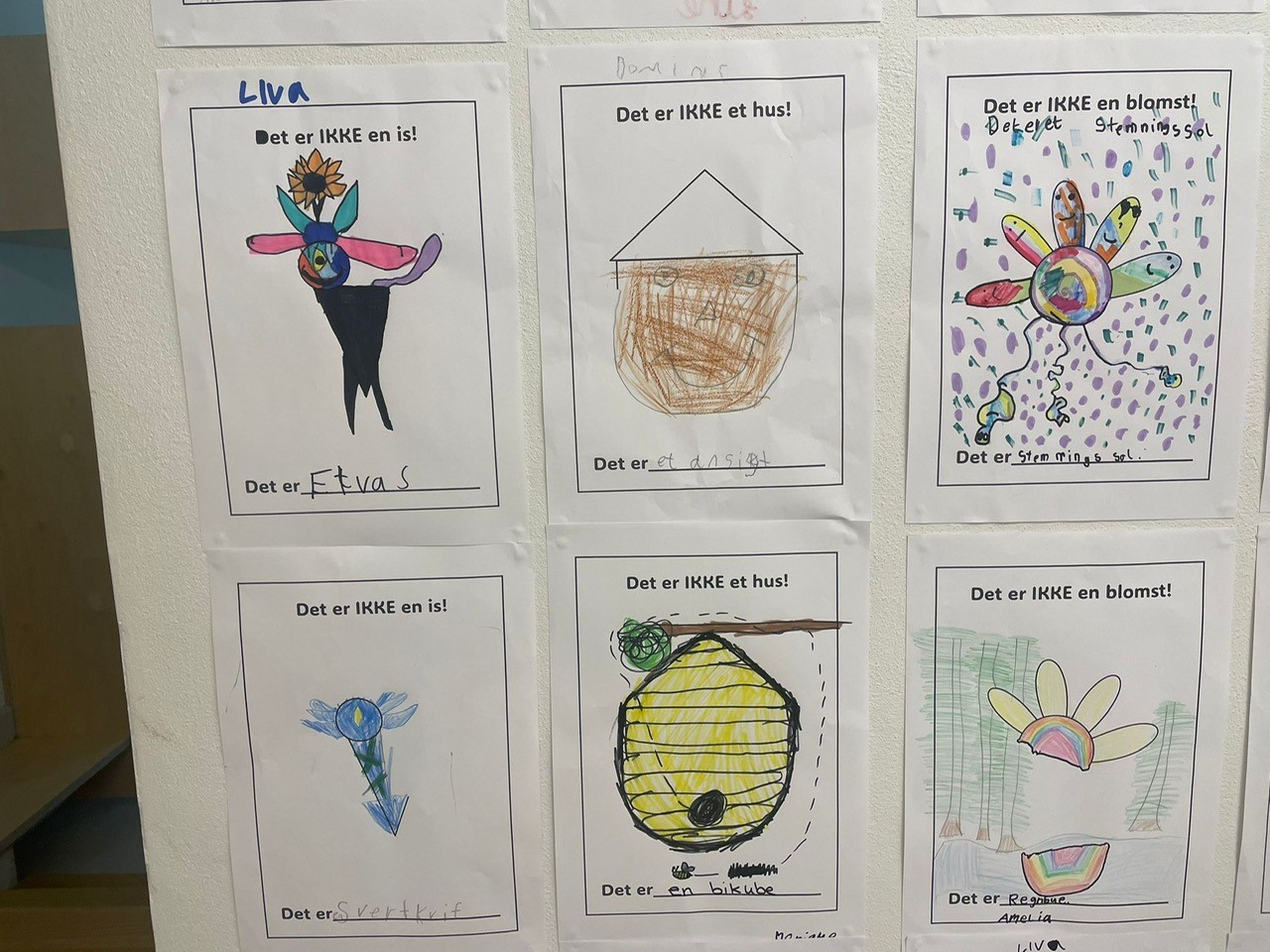 I skolens fællesområde kan alle nyde flotte kunstværker, som indskolingen har lavet. Eleverne fik udlevet halv færdige billeder, som de skulle tegne videre på. Overskriften er "Det er ikke...".