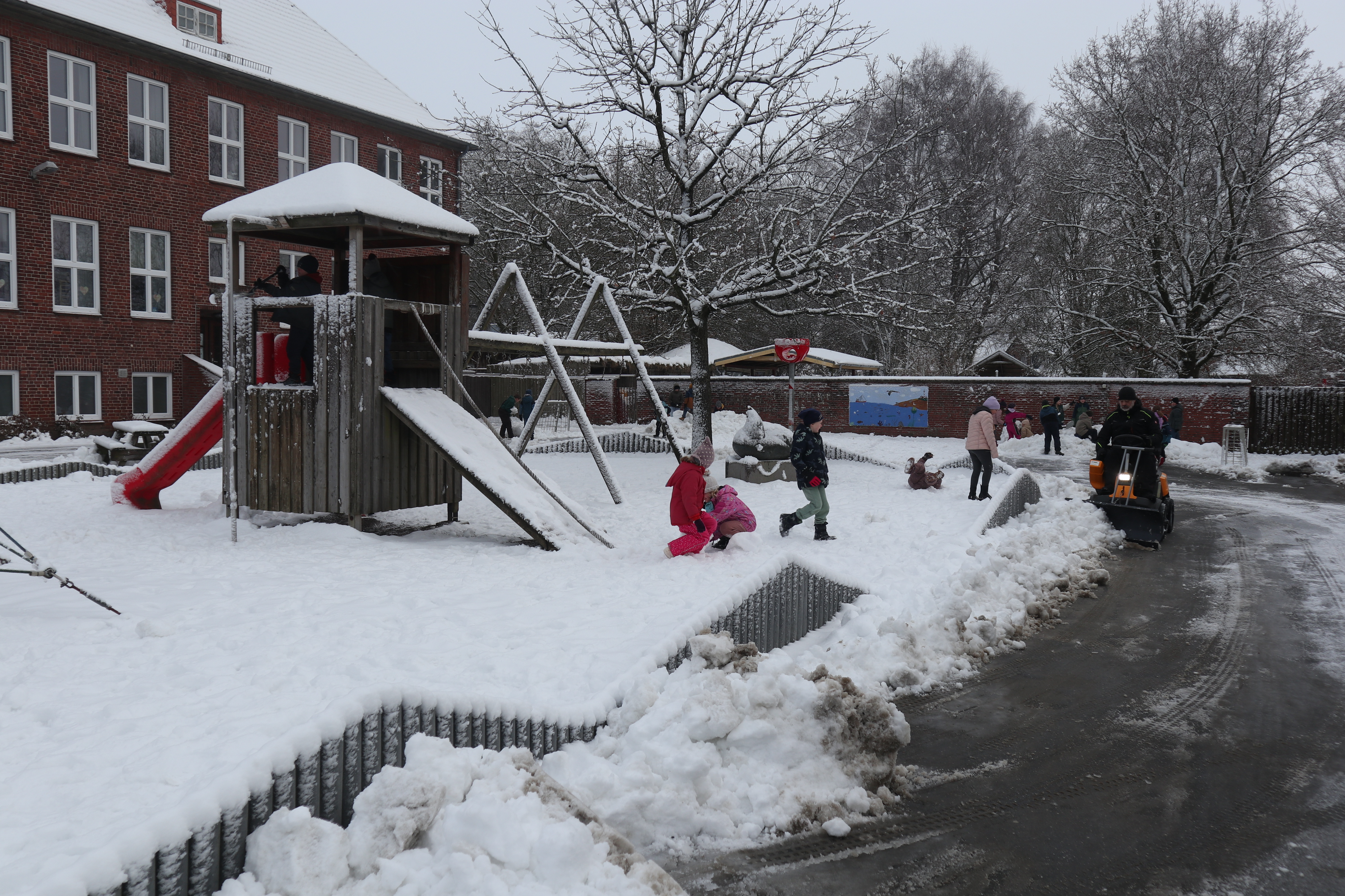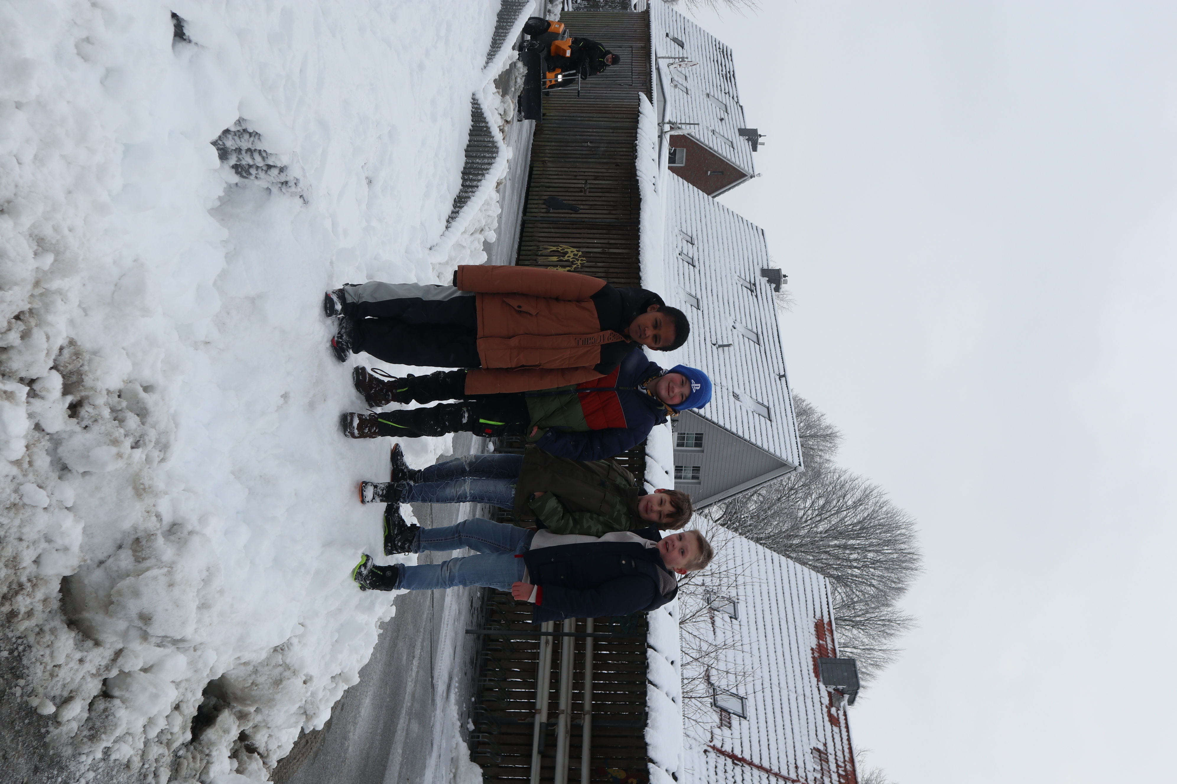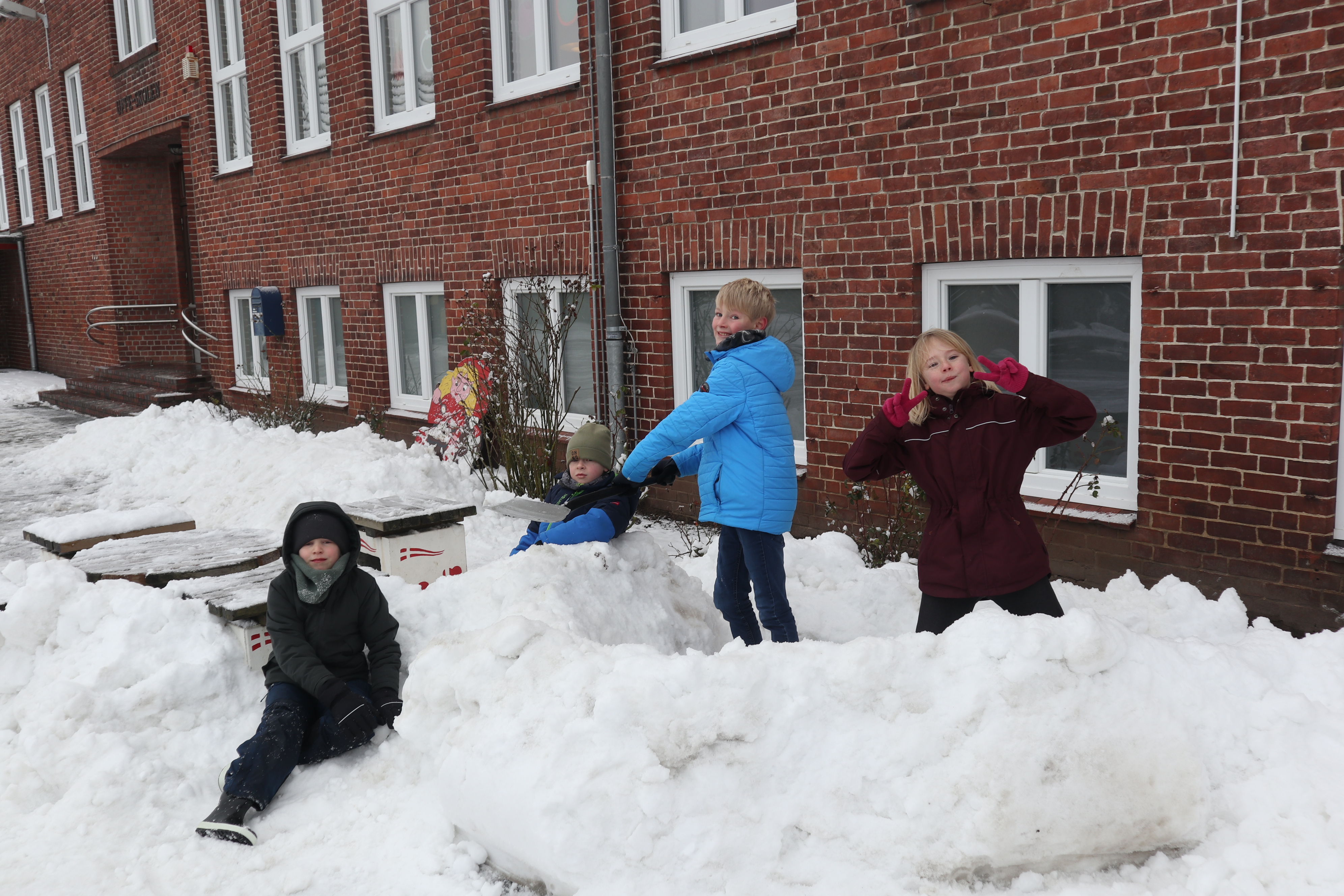 Skolegården blev forvandlet til et ægte vinterlandskab, da sneen dækkede området og gav eleverne en oplevelse, som mange af dem ikke tidligere har prøvet – hverken så meget sne eller så voldsomt vintervejr.