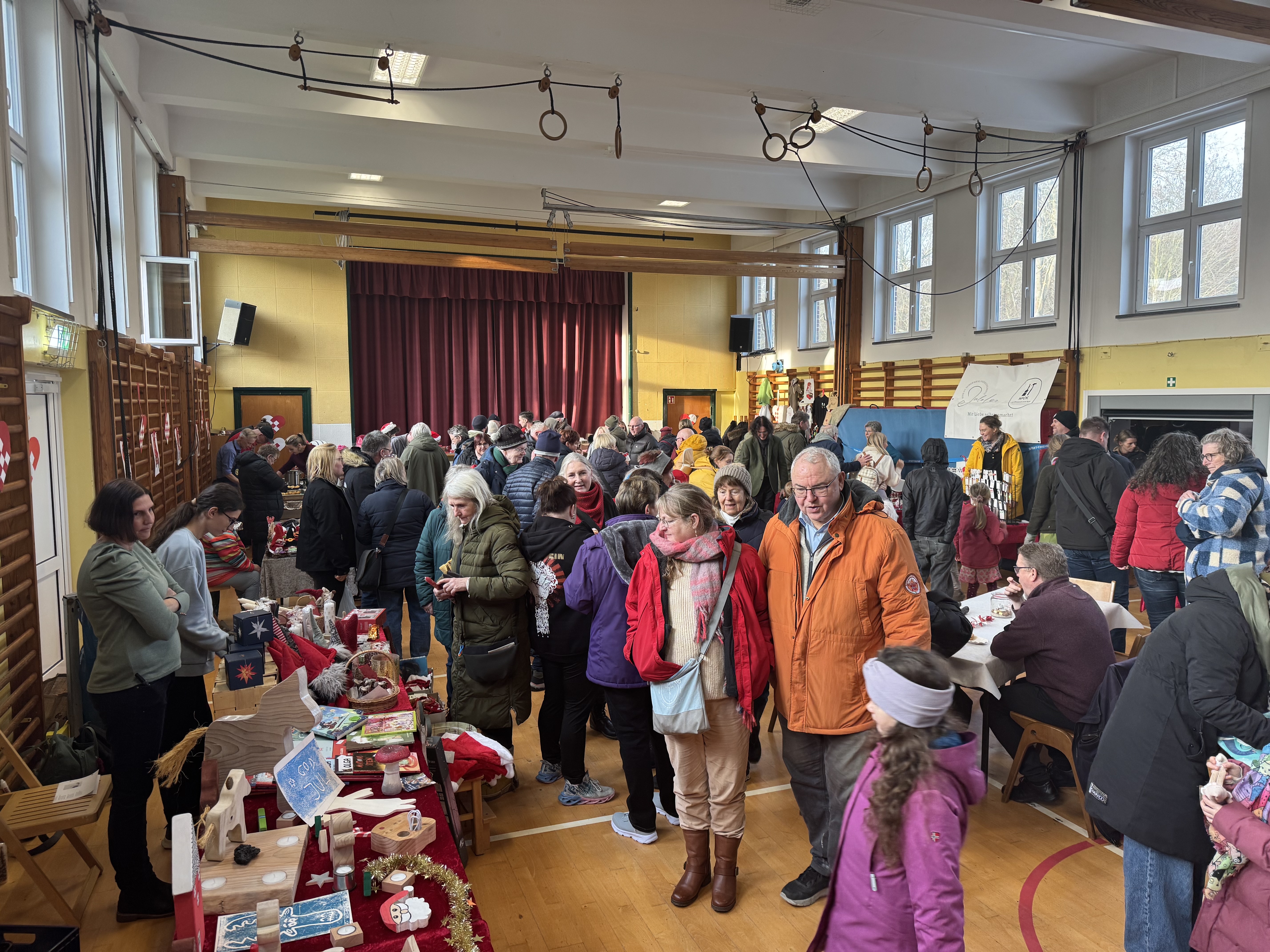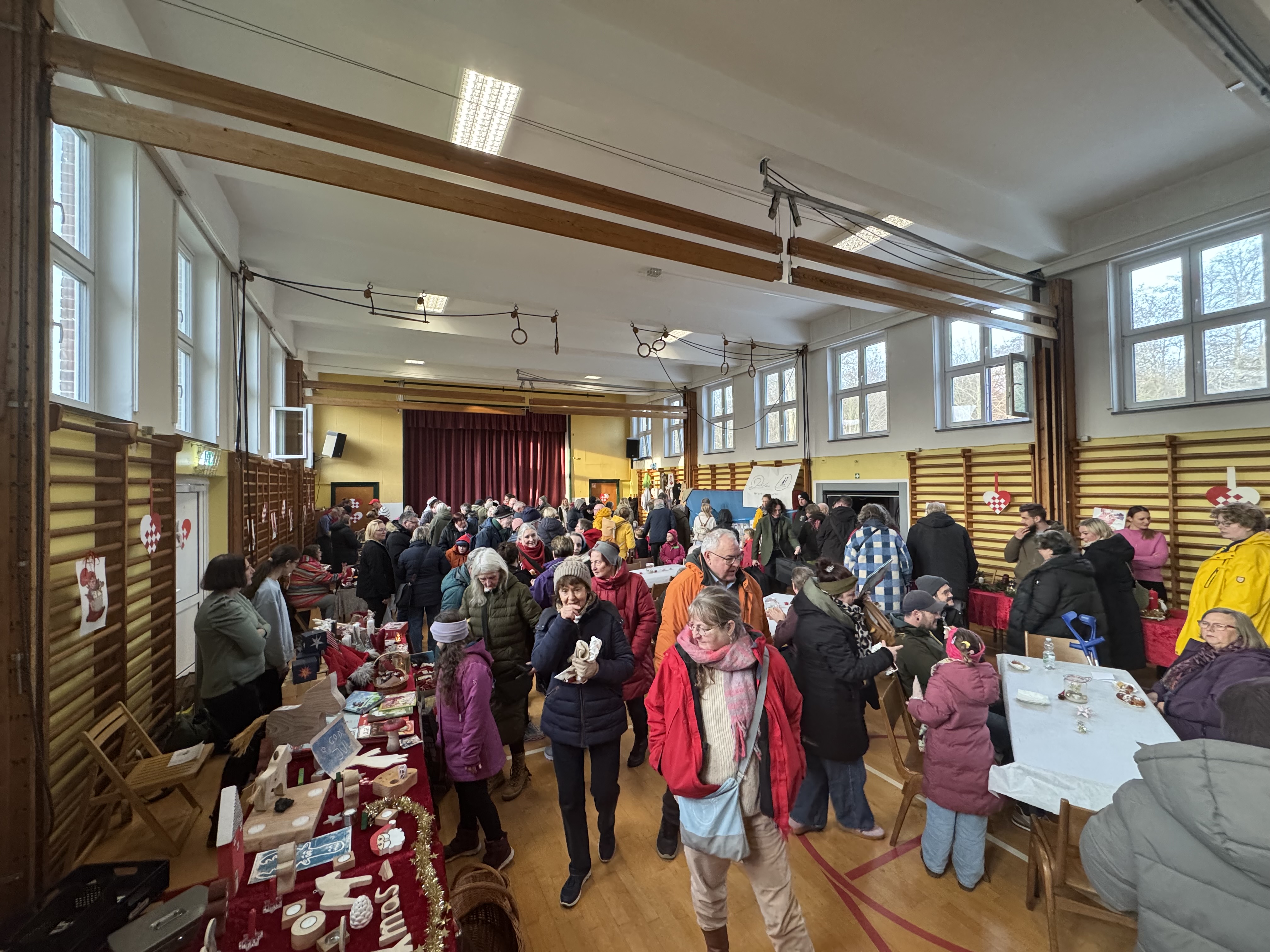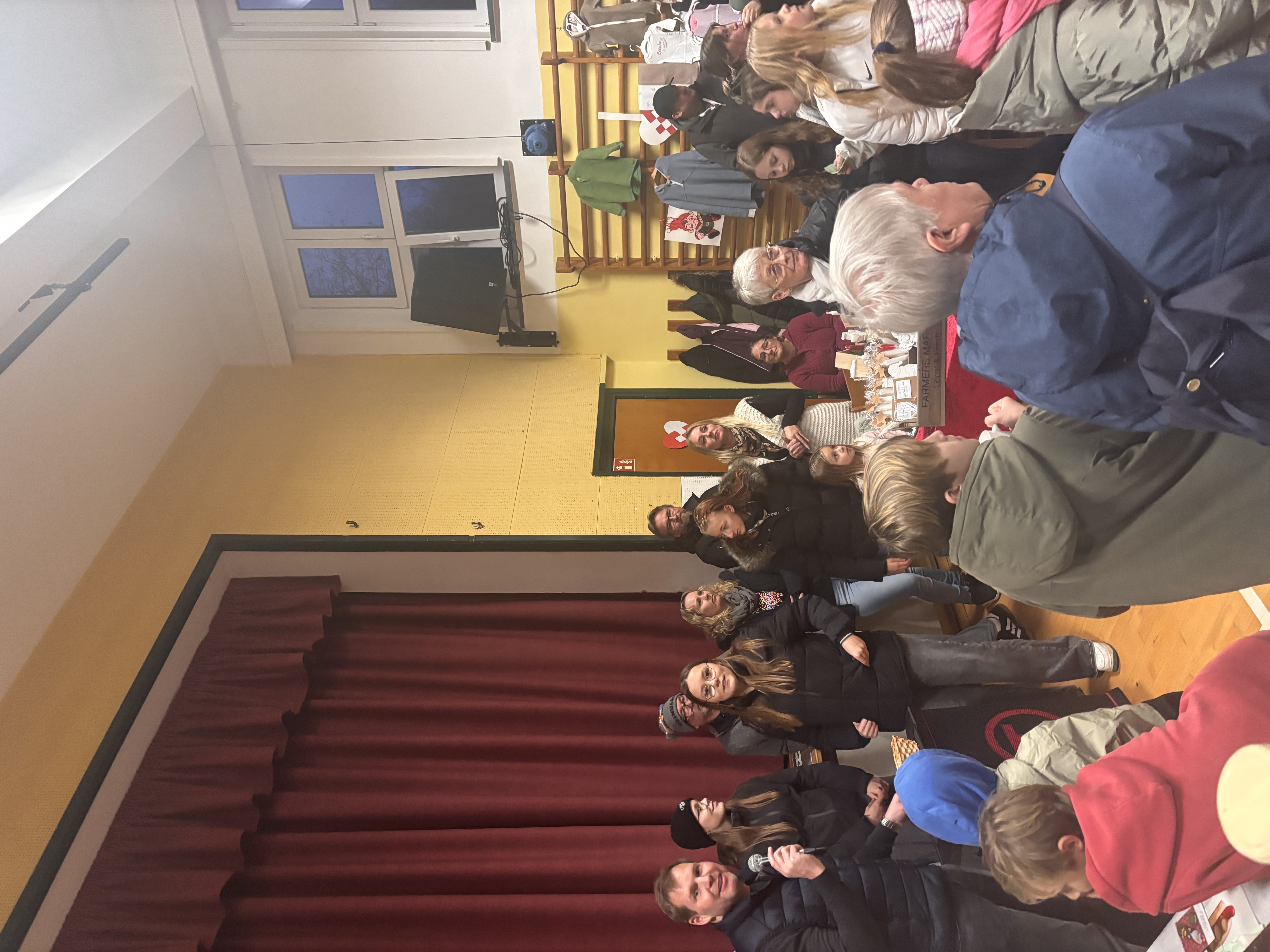 Efter rigtig mange år kunne vi igen afholde vores julemarked i gymnastiksalen – og hvilken tilbagekomst! I år var vi så heldige, at IF Tönning stillede klubhuset til rådighed, så området kunne udvides med en hyggelig indendørs gårdhave fyldt med boder. Her blev der budt på alt fra gløgg og grillpølser til varm drikkelse og bålhygge, som skabte den helt rette julestemning.