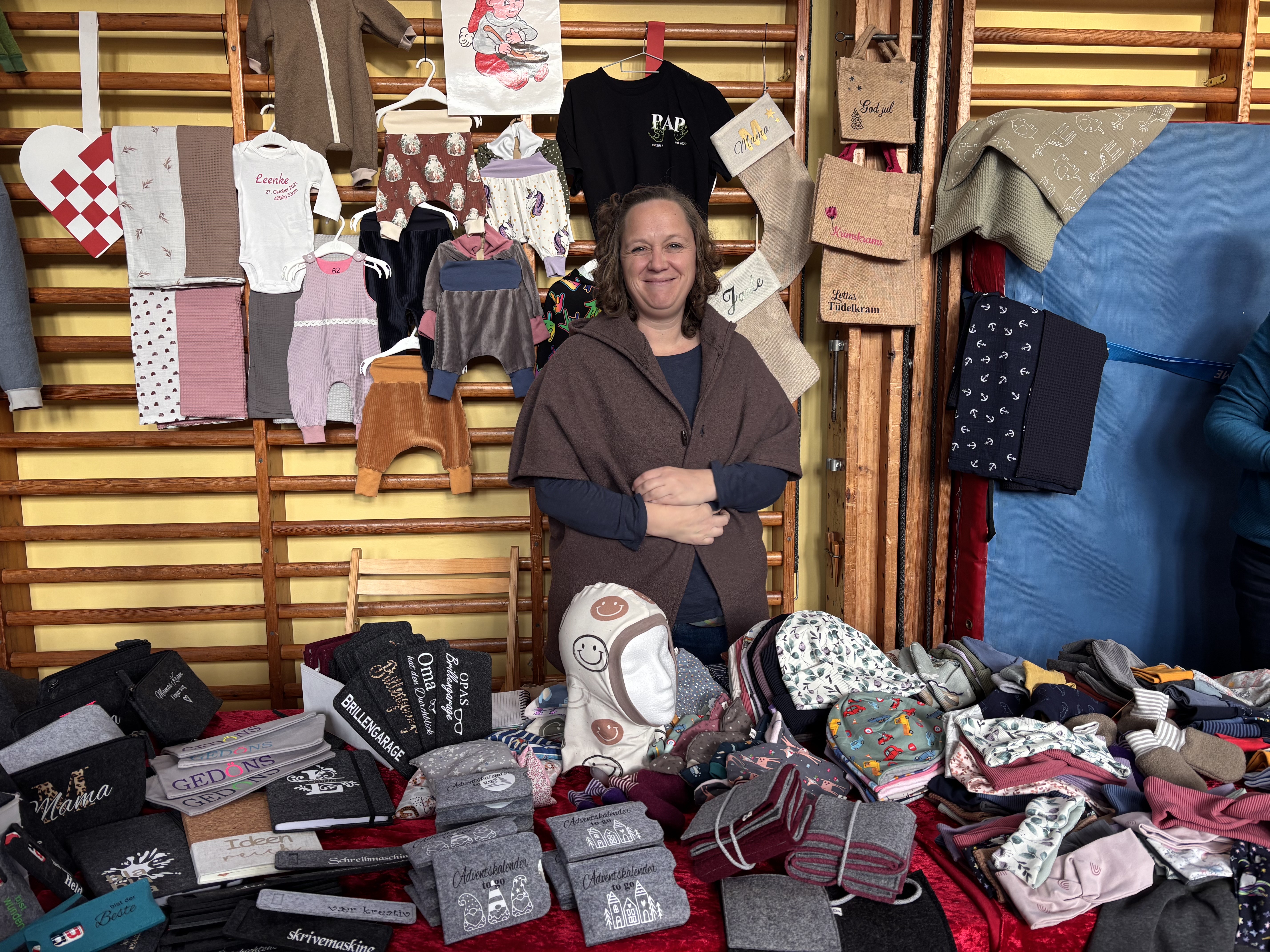 Inde i gymnastiksalen summede det af liv. Her kunne man gå på opdagelse blandt loppemarkedsfund, hjemmestrik, dekorationer og smykker. Og hvis sulten meldte sig, var der æbleskiver, hotdogs og friskbagte boller at købe.