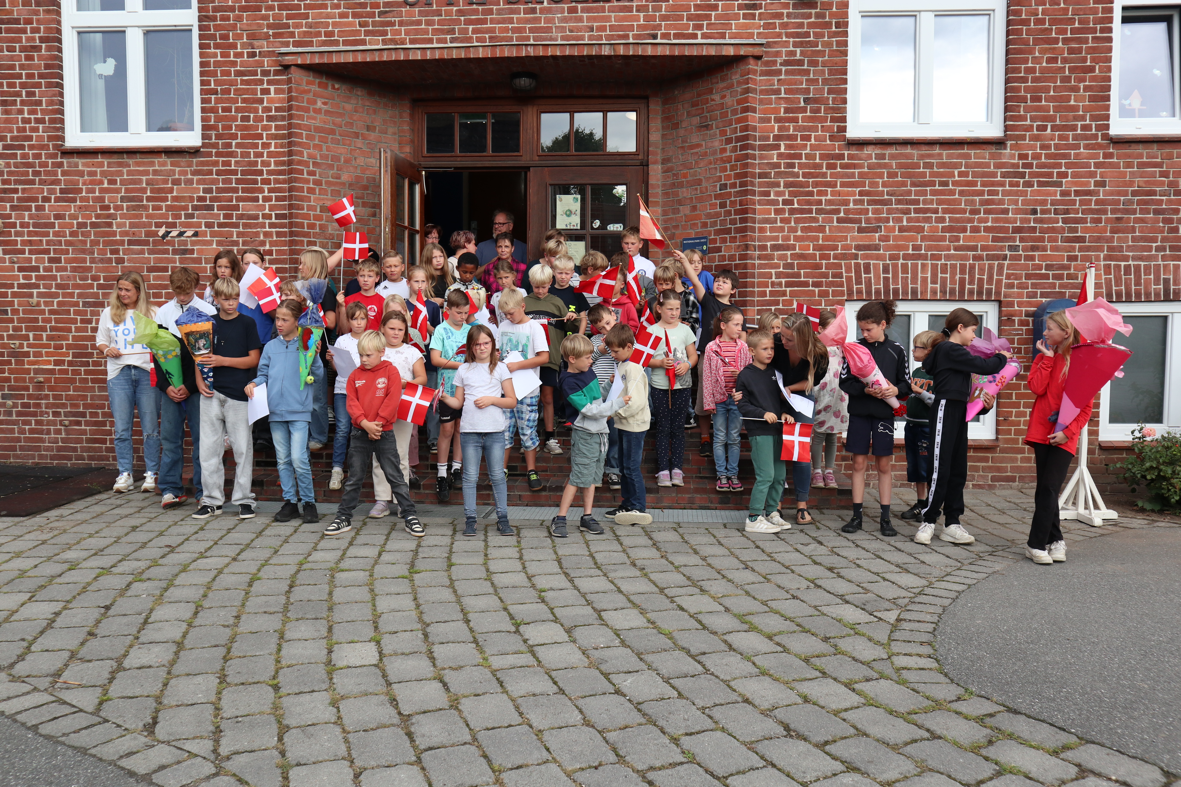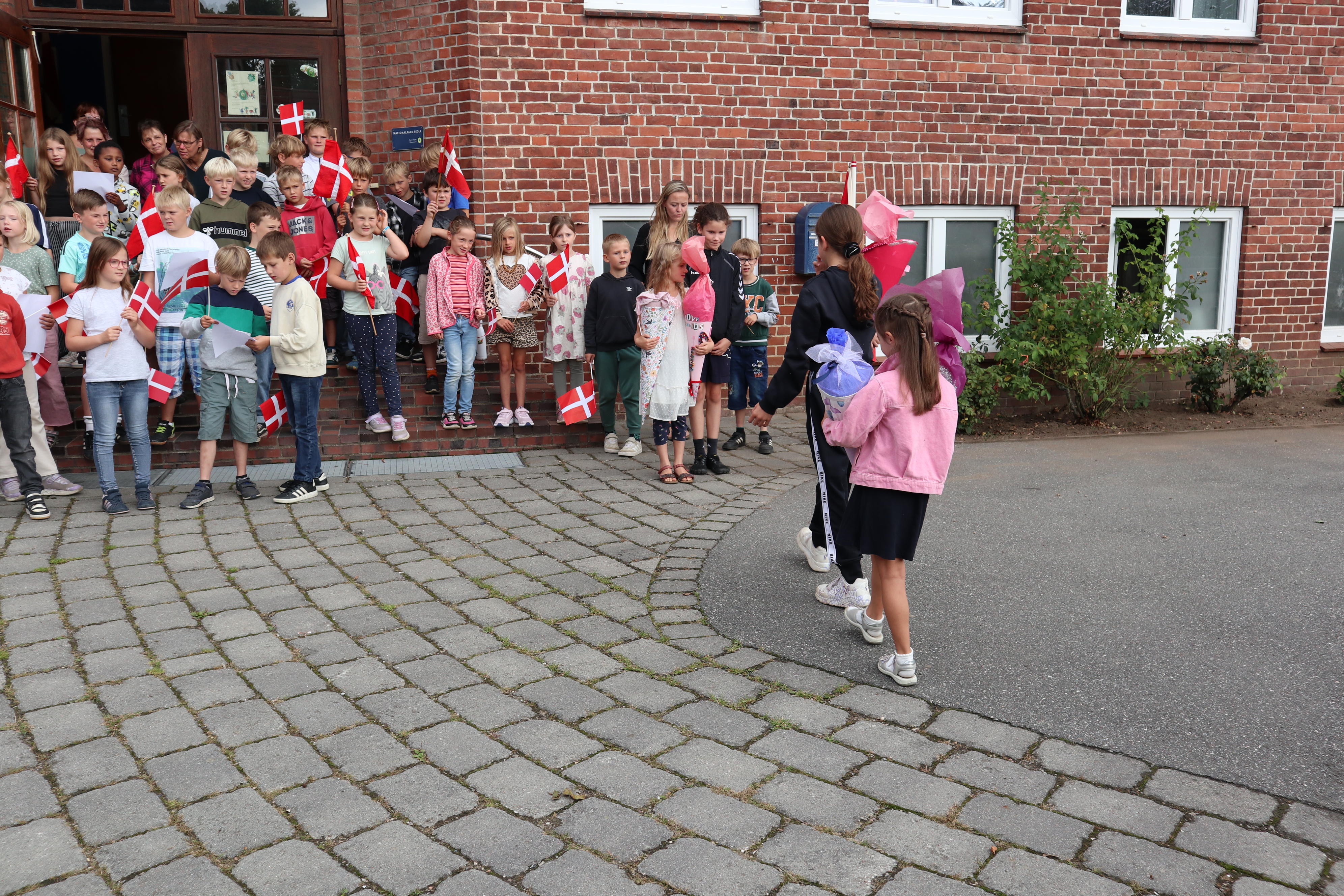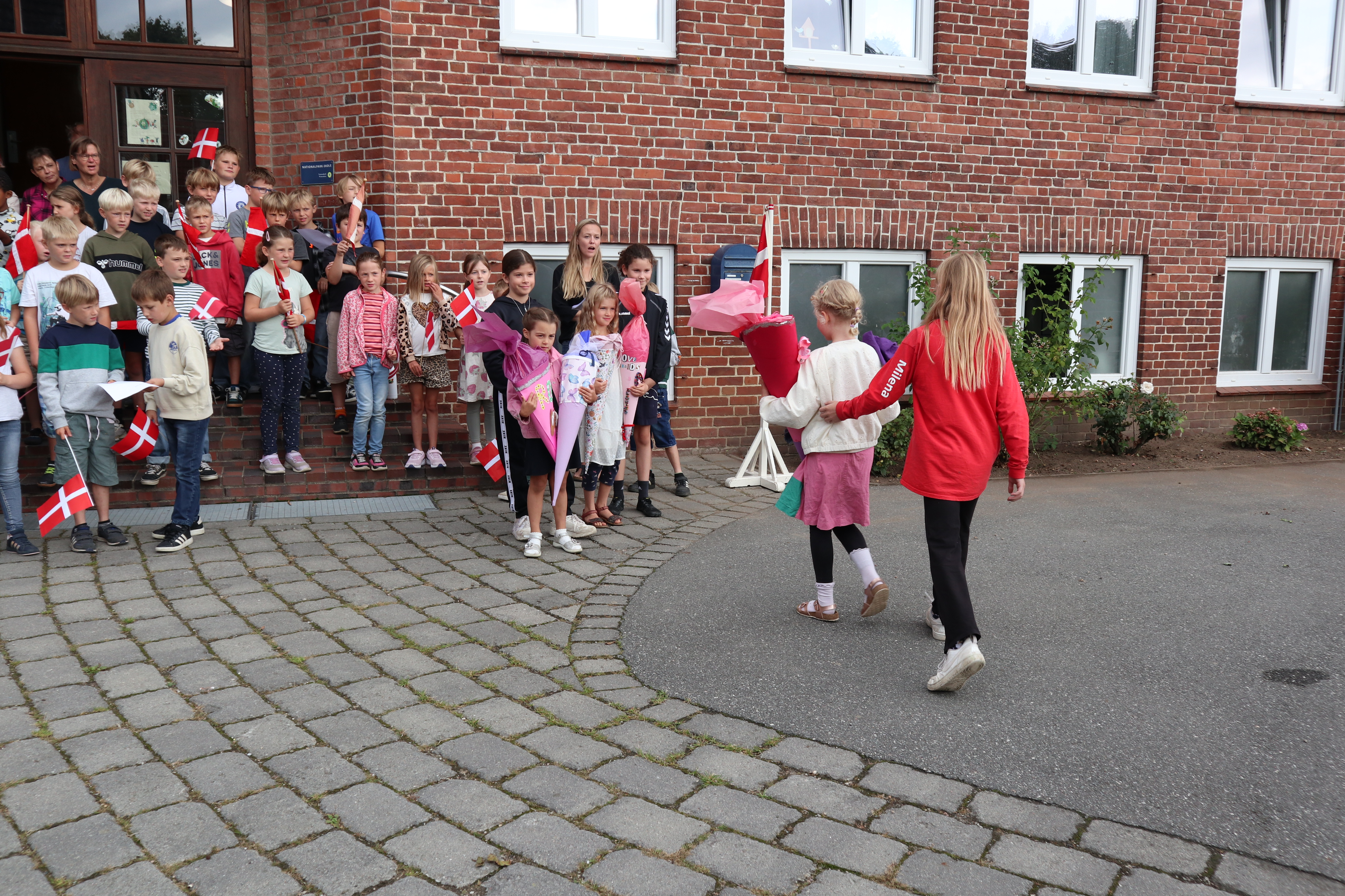 Skoleleder Göran bød varmt velkommen til både elever og deres familier, og hele skolen sang sammen for at fejre de nye skolekammerater. Imens hentede deres kommende skolevenner dem væk fra forældrene og ind i det trygge fællesskab – og overrakte dem hver især en selvlavet skolepose som en personlig velkomstgave.