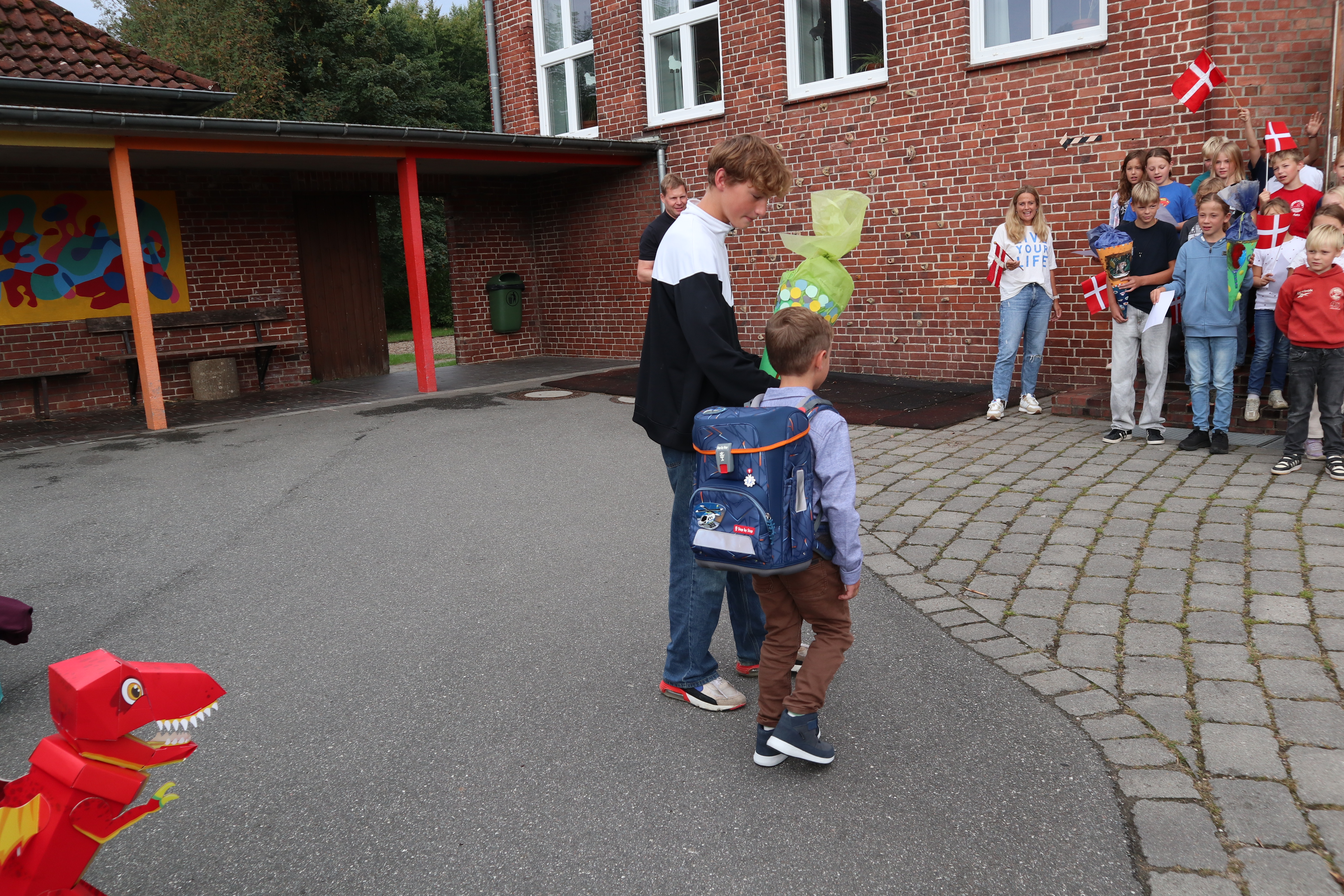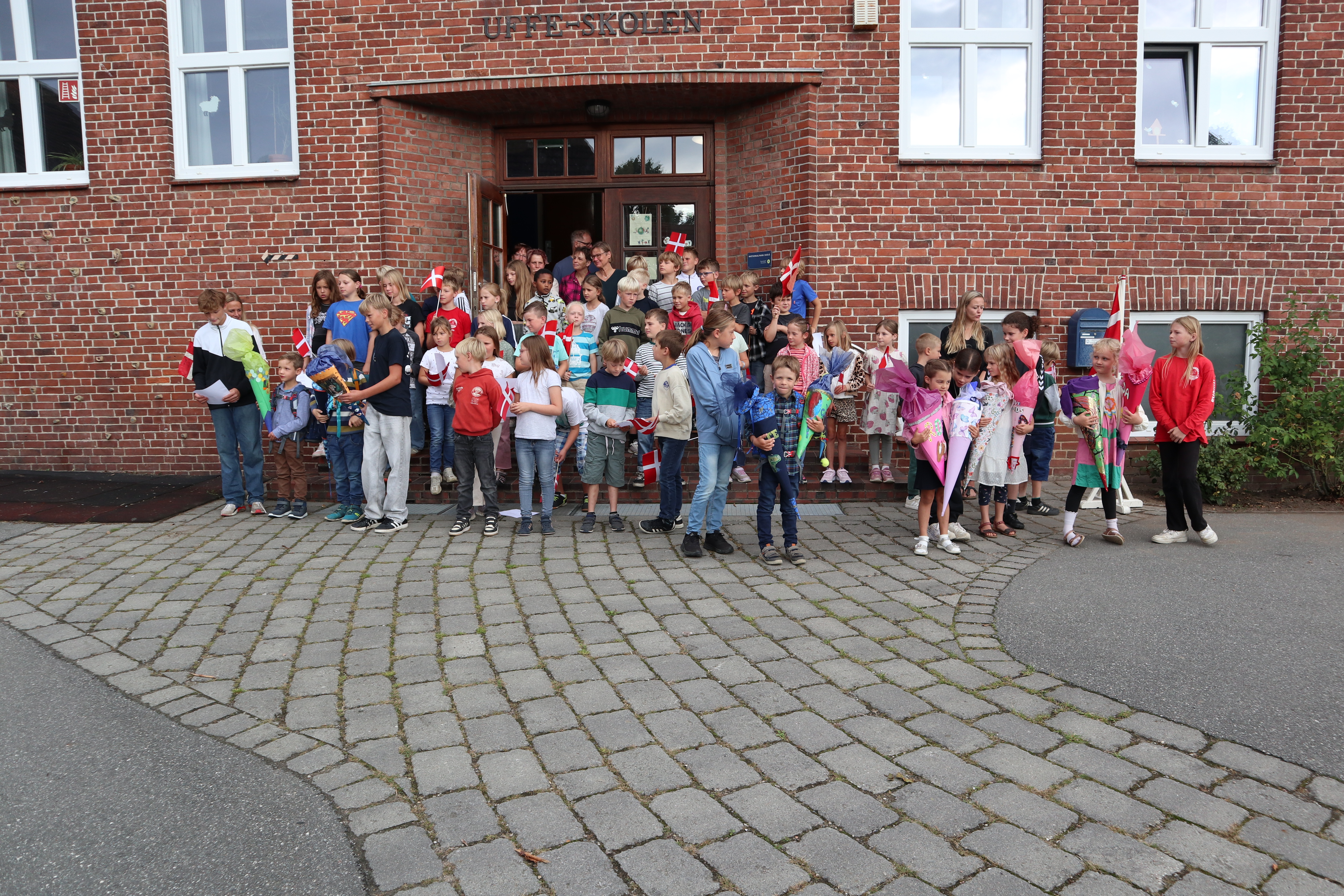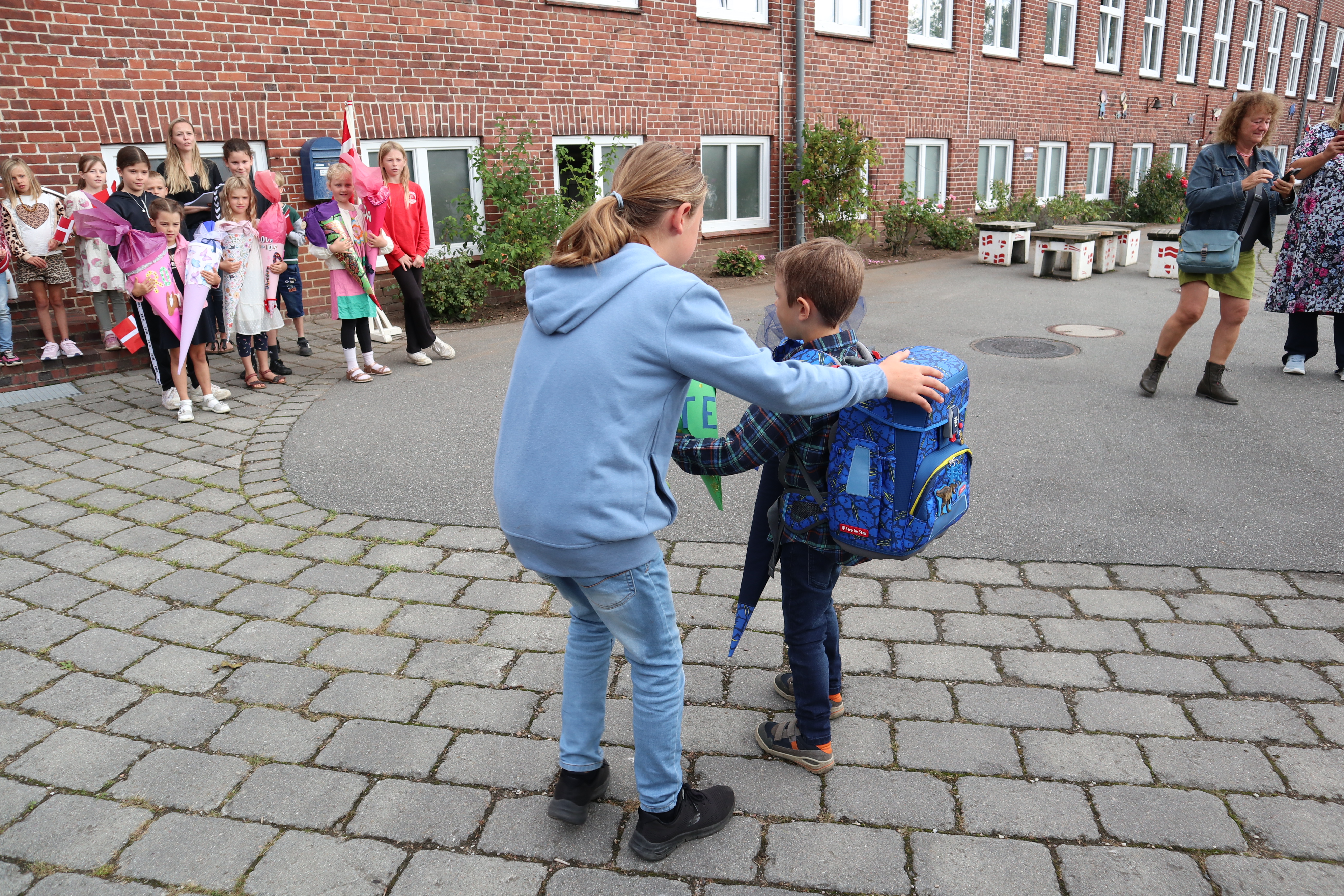 Skoleleder Göran bød varmt velkommen til både elever og deres familier, og hele skolen sang sammen for at fejre de nye skolekammerater. Imens hentede deres kommende skolevenner dem væk fra forældrene og ind i det trygge fællesskab – og overrakte dem hver især en selvlavet skolepose som en personlig velkomstgave.