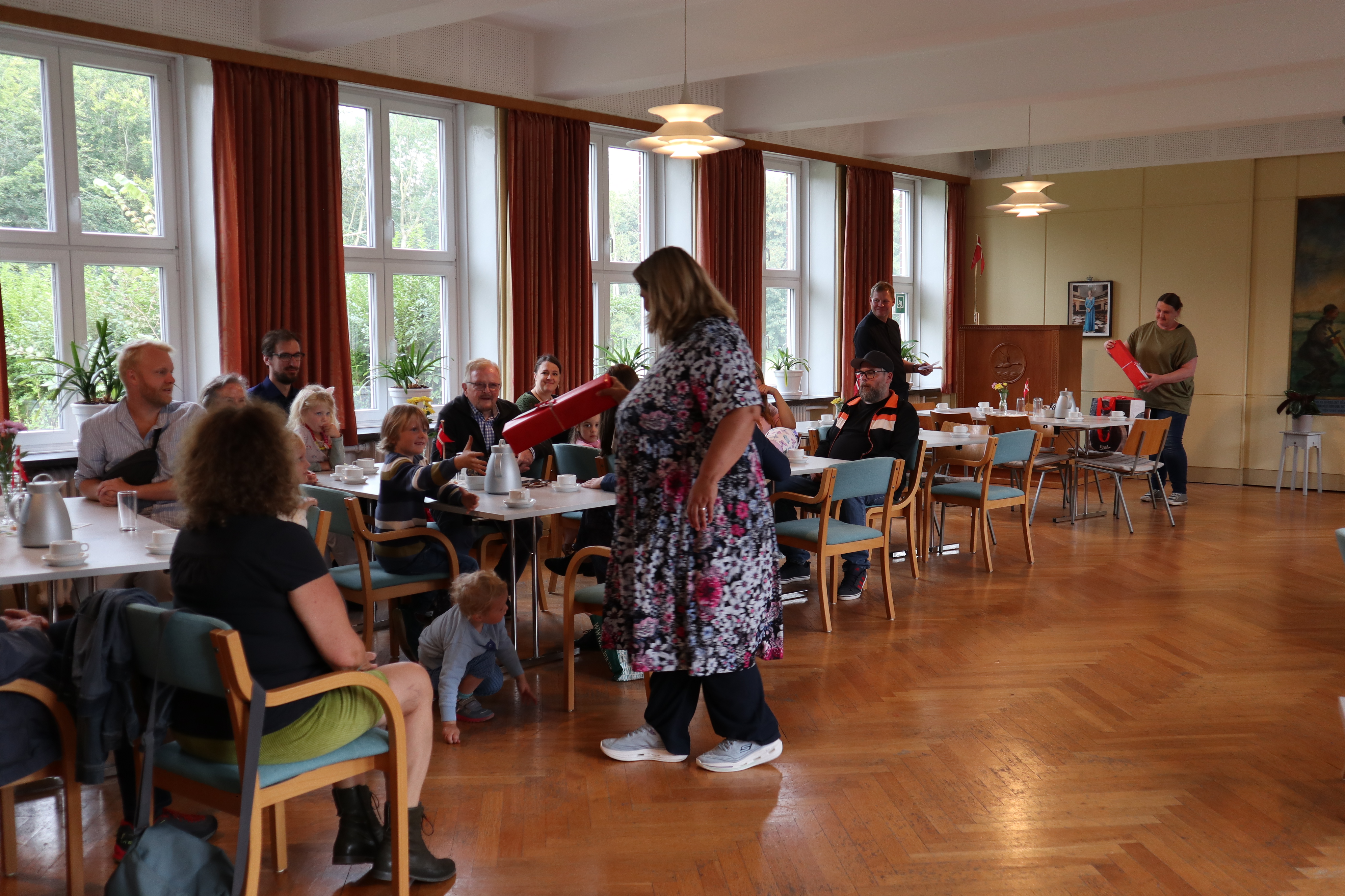 Efterfølgende blev der taget billeder, og da det var overstået måtte alle finde plads i kirkesalen, hvor Kerstin og Andrea på vegne af SSF overrakte en bord-Dannebrog som indskolingsgave til hver elev.
